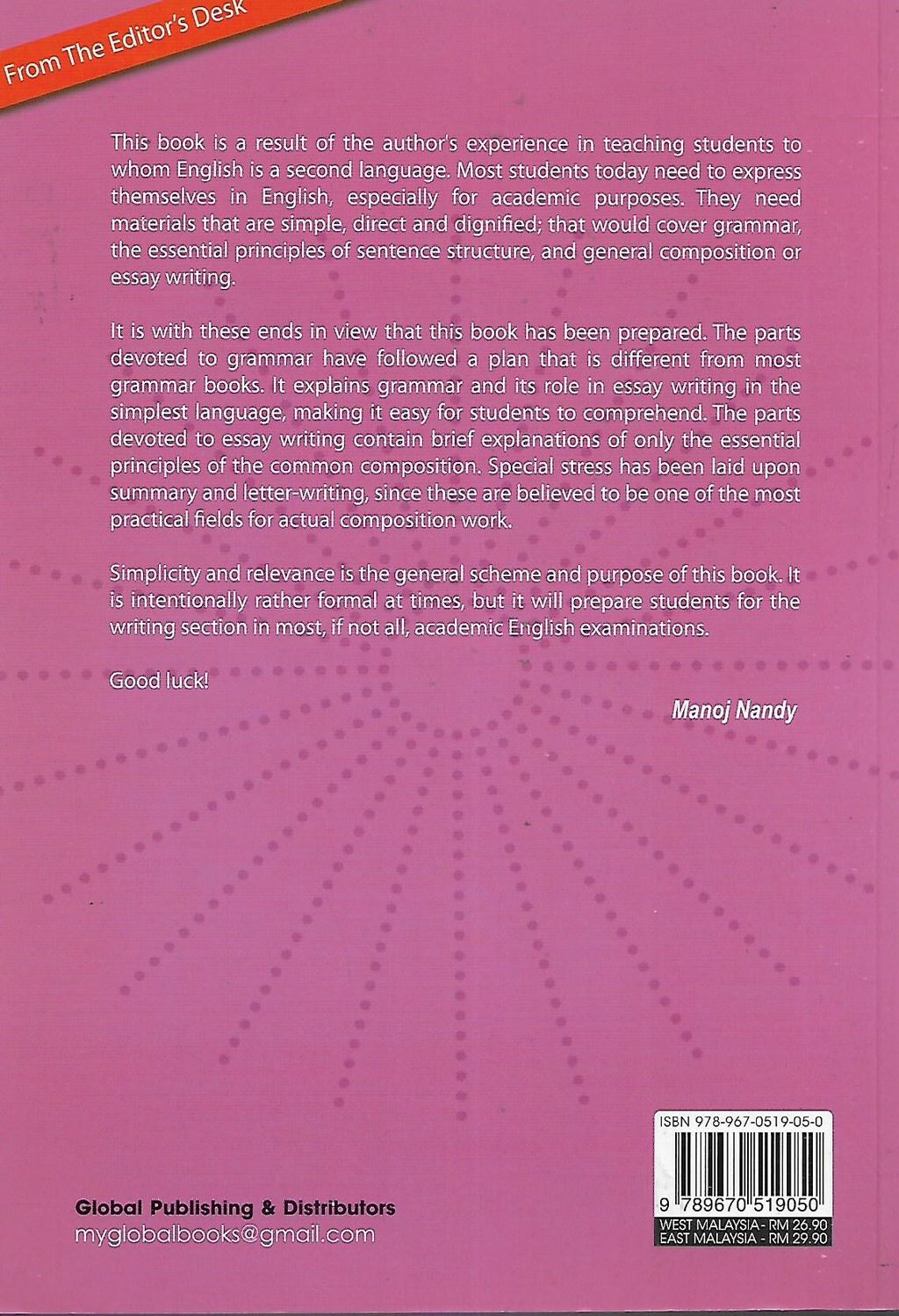 This book is a result of the author's experience in teaching students to whom English is a second language. Most students today need to express themselves in English, especially for academic purposes. They need materials that are simple, direct and dignified; that would cover grammar, the essential principles of sentence structure, and general composition or essay writing.