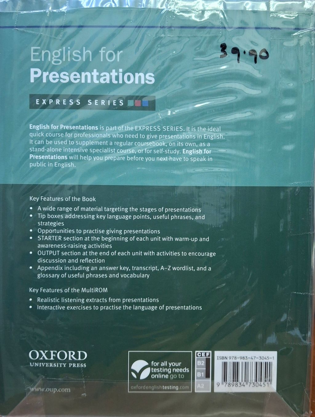 Englsih for Presentations is part of the Express Series. It is the ideal quick course for prefoessional who need to give presentations in English. It can be used to supplement a regular coursebook, on itsown, as a stand-alone intensive specialist course, or for self-study. English for Presentations will help you prepare before you next have to speak in public in English.