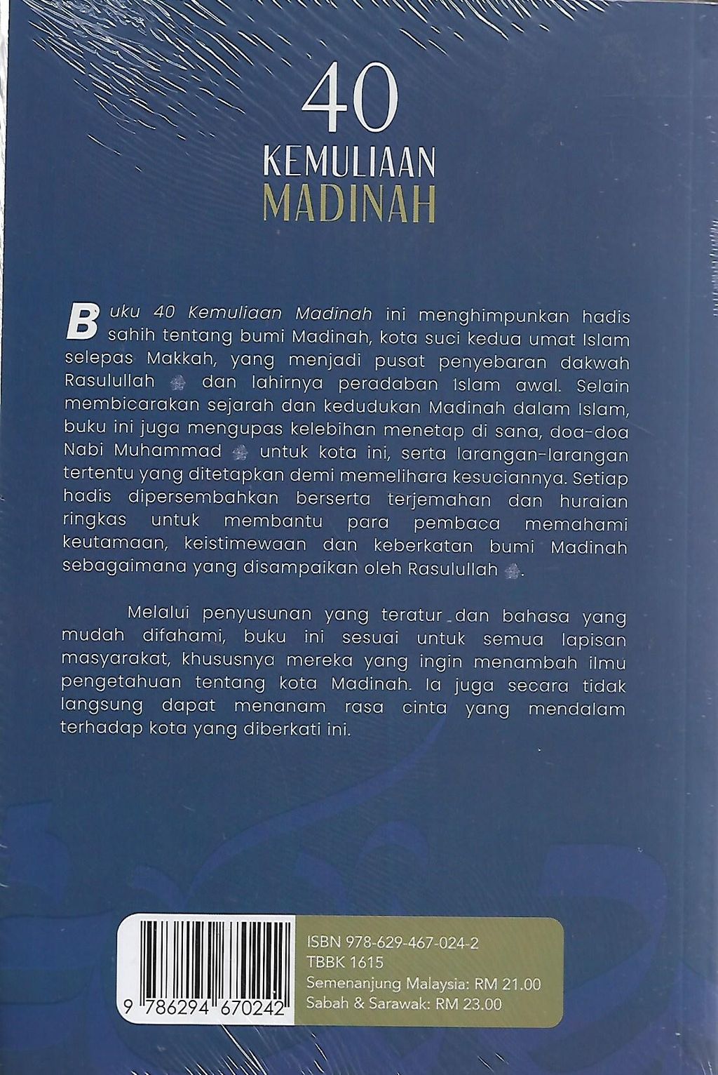 Buku 40 Kemuliaan Madinah menghimpunkan hadis sahih tentang bumi Madianh, kota suci kedua umat Islam selepas Makkah, yang menjadi pusat penyebaran dakwah Rasulullah saw dan lahirnya peradaban Islam awal. Selain membicarakan sejarah dan kedudukan Madinah dalam Islam, buku ini juga mengupas kelebihan menetap di sana, doa-doa Nabi Muhammad saw untuk kota ini, serta larangan-larangan tertentu yang ditetapkan demi memelihara kesuciannya. Setiap hadis dipersembahkan berserta terjemahan dan huraian ringkas untuk membantu para pembaca memahami keutamaa, keistimewaan dan keberkatan bumi Madinah sebagaimana yang disampaikan oleh Rasulullah saw.