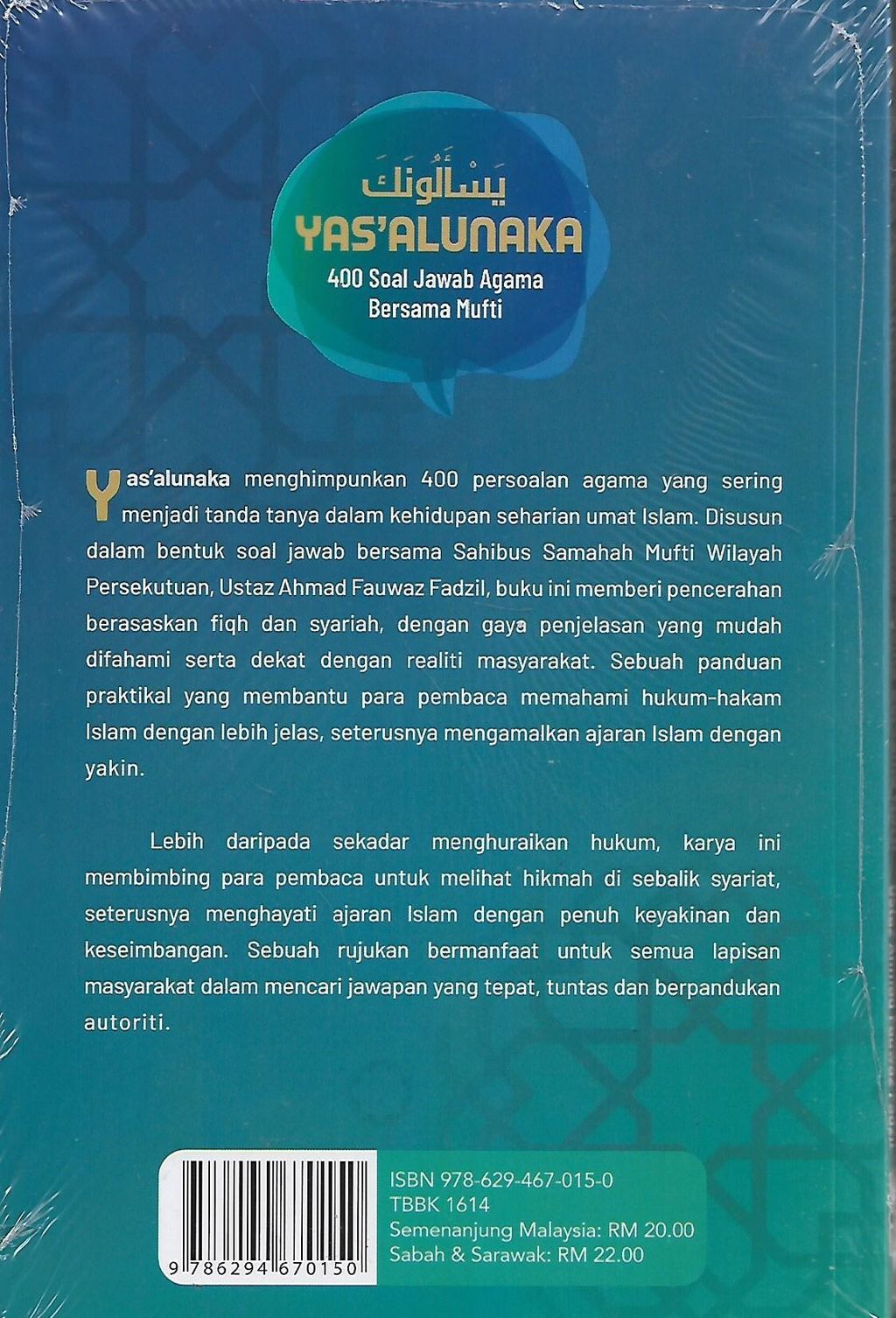 Yas’alunaka menghimpunkan 400 persoalan agama yang sering menjadi tanda tanya dalam kehidupan seharian umat Islam. Disusun dalam bentuk soal jawab bersama Sahibus Samahah Mufti Wilayah Persekutuan, Ustaz Ahmad Fauwaz Fadzil, buku ini memberi pencerahan berasaskan fiqh dan syariah, dengan gaya penjelasan yang mudah difahami serta dekat dengan realiti masyarakat. Sebuah panduan praktikal yang membantu para pembaca memahami hukum-hakam Islam dengan lebih jelas, seterusnya mengamalkan ajaran Islam dengan yakin.