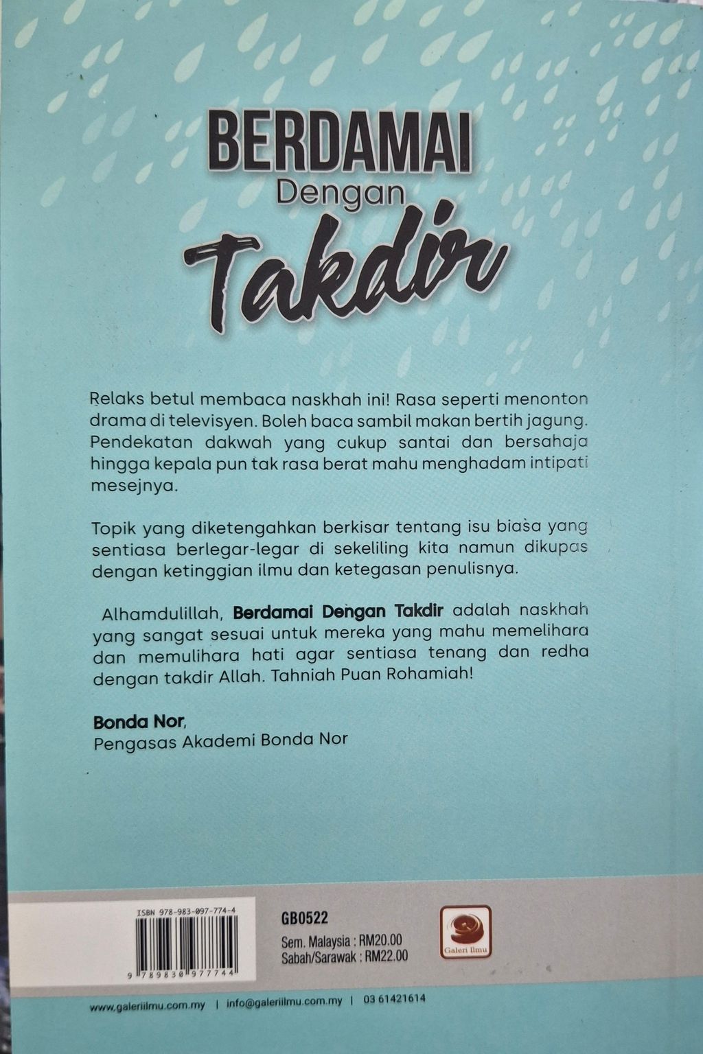 Alhamdulillah, Berdamai Dengan Takdir adalah naskah yang sangat sesuai untuk mereka yang mahu memelihara dan memulihara hati agar sentiasa tenang dan redha dengab takdir Allah. Tahniah Puan Rohamiah!