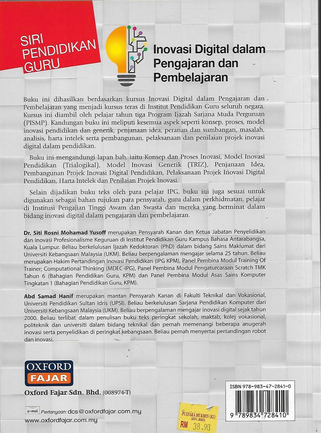 Buku ini dihasilkan berdasarkan kursus Inovasi Digital dam Pengajaran dan Pembelajaran yang menjadi kursus teras di Institut Pendidikan Guru seluruh negara. Kandungan buku ini meliputi aspek seperti konsep, proses, model inovasi, pendidikan dan generik, penjanaan idea, peranan dan sumbangan, masalah, analisis, harta intelek serta pembangunan, pelaksanaan dan penilaian projek inovasi digital dalam pendidikan.