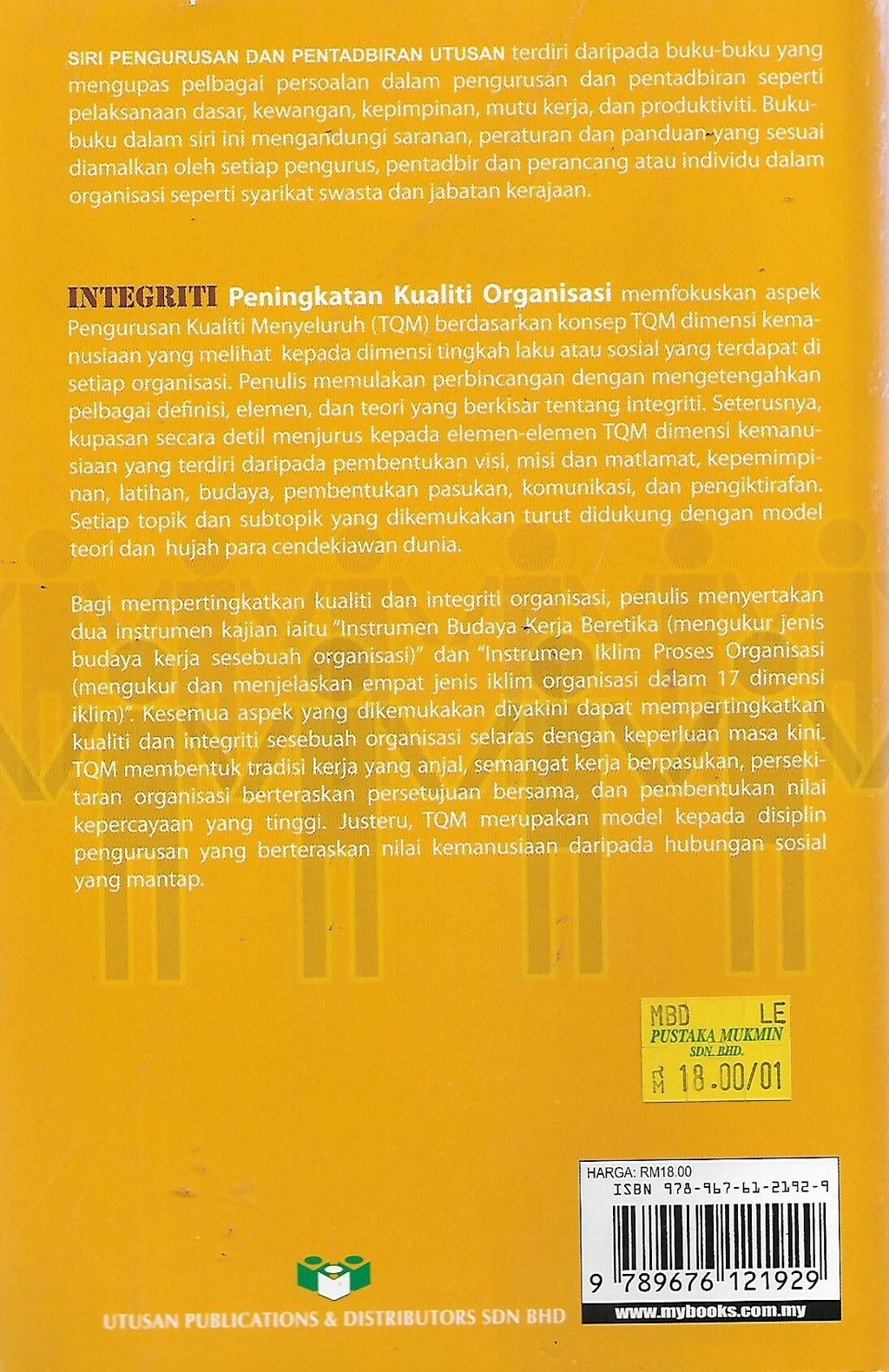 Integriti Peningkatan Kualiti Organisasi memfokus aspek Pengurusan Kualiti Menyeluruh (TQM) berdasarkan konsep TQm dimensi kemanusiaan yang melihat kepada dimensi tingkah laku atau sosial yang terdapat di pelbagai definisi, elemen, dan teori yang berkisar tentang integriti.