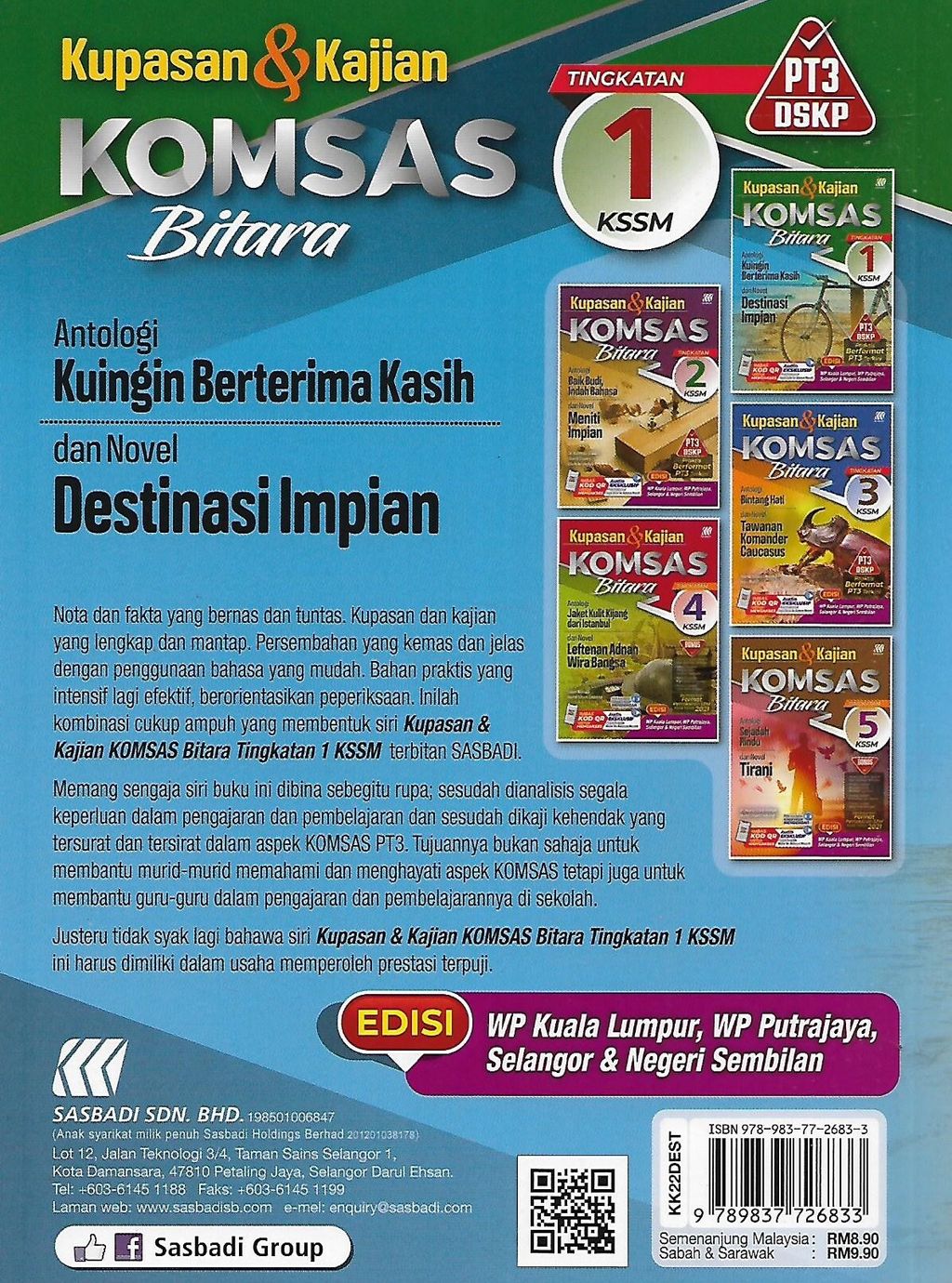 Nota dan fakta yang bernas dan tuntas. Kupasan dan kajian yang lengakap dan mantap. Persembahan yang kemas dan jelas dengan penggunaan bahasa yang mudah. Bahan praktis yang intensif lagi efektif, berorentasikan peperiksaan. Inilah kombinasi cukup ampuh yang membentuk siri Kupasan & Kajian Komsas Bitara: Tingkatan 1 KSSM terbitan SASBADI.