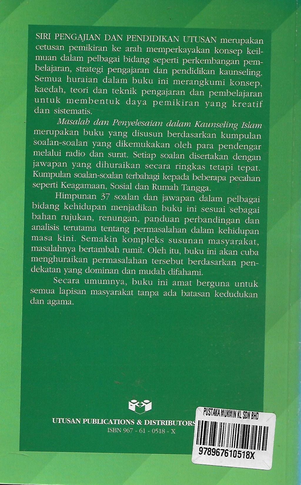 Masalah dan Penyelesaian dalam Kaunseling Islam merupakan buku yang disusun berdasarkan kumpulan soalan-soalan yang dikemukakan oleh para pendengar melalui radio dan surat. Setiap soalandisertakan dengan jawapan ynag dihuraikan secara ringkas tetapi tepat. Kumpulan soalan-soalan terbahagi kepada beberapa pecahan seperti keagamaan, sosial dan rumah tangga.