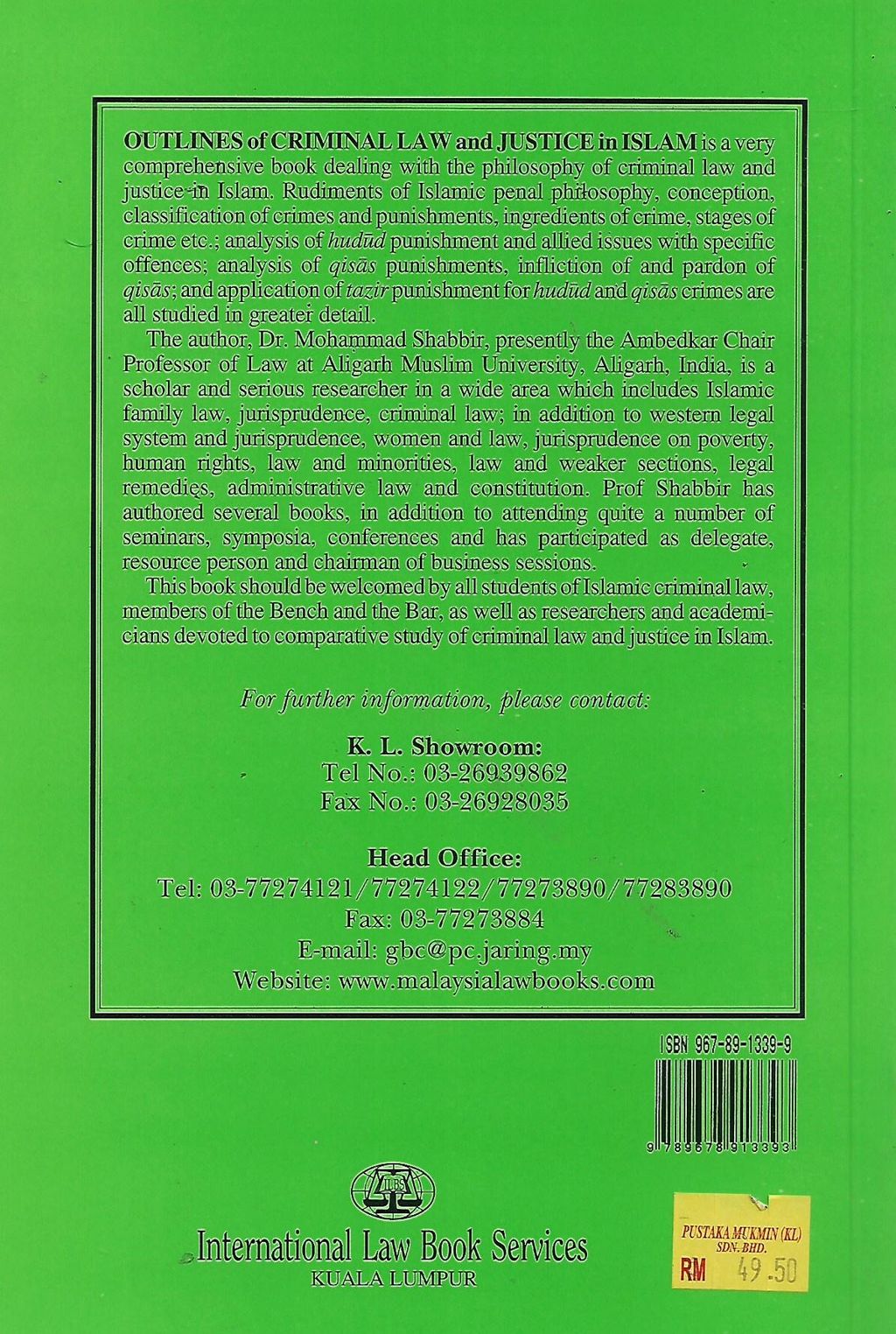 Outlines of Criminal Law and Justice in Islam is a very comprehensive book dealing with the philosophy of criminal law and justice in Islam. Rudiments of Islamic penal philosophy, conception, classification of crimes and punishments, ingredients of crimes, stages of crime etc.: analysis of hudud punishments and allied issues with specific offences: analysis of qisas punishments, infliction of and pardon of qisas; and application of tazir punishment for hudud and qisas crimes are all studied in greater detail.