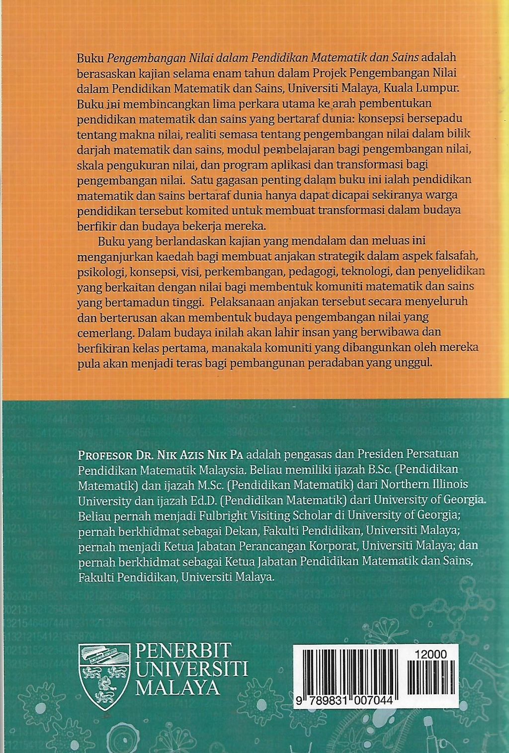 Buku Pengembangan Nilai Dalam Pendidikan Matematik dan Sains adalah berasaskan kajian selama enam tahun dalam projek Pengembangan Nilai dalam Pendidikan Matematik dan Sains, Universiti Malaya. Buku ini membincangkan lima perkara utama ke arah pendidikan matematik dan sains yang bertaraf dunia.
