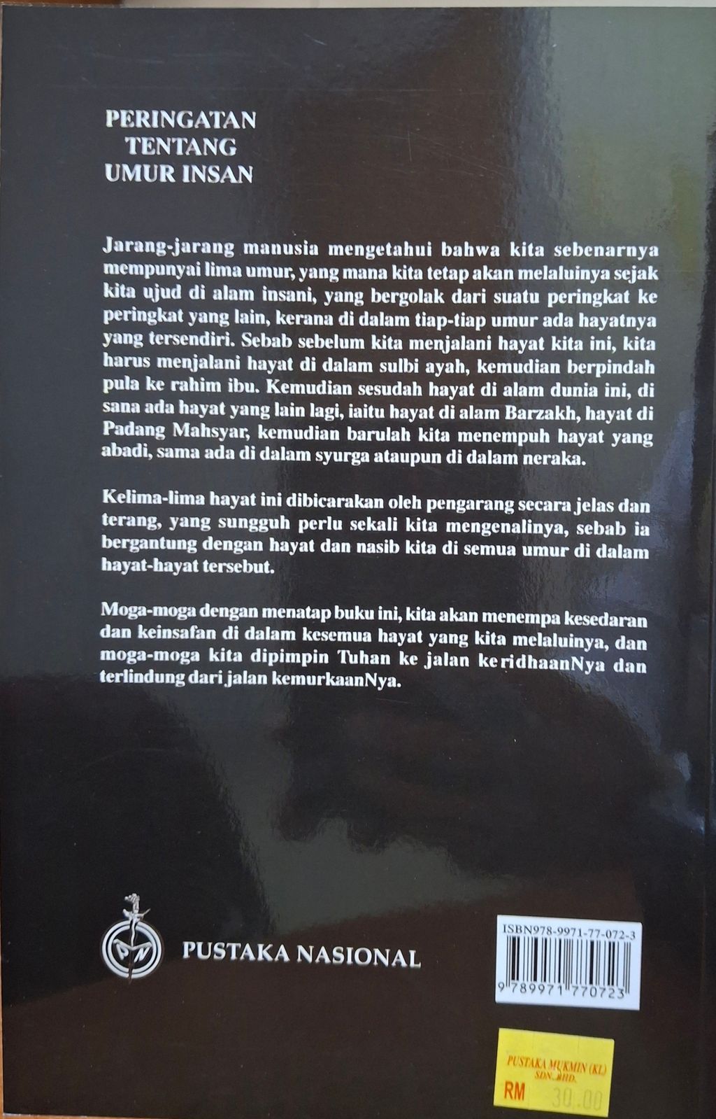 Jarang-jarang manusia mengetahui bahawa kita sebenarnya mempunyai lima umur, yang mana kita tetap akan melaluinya sejak kita ujud di alam insani, yang bergolak dari suatu peringkat ke peringkat yang lain, kerana di dalam tiap-tiap umur ada hayatnya yang tersendiri. Sebab sebelum kita menjalani hayat kita ini, kita harus menjalani hayat di dalam sulbi ayah, kemudian berpindah pula ke rahim ibu. Kemudian sesudah hayat di alam dunia ini, di sana ada hayat yang lain lagi, iaitu hayat di alam Barzakh, hayat di Padang Mahsyar, kemudian barulah kita menempuh hayat yang abadi, sama ada di dalam syurga ataupun di dalam neraka.