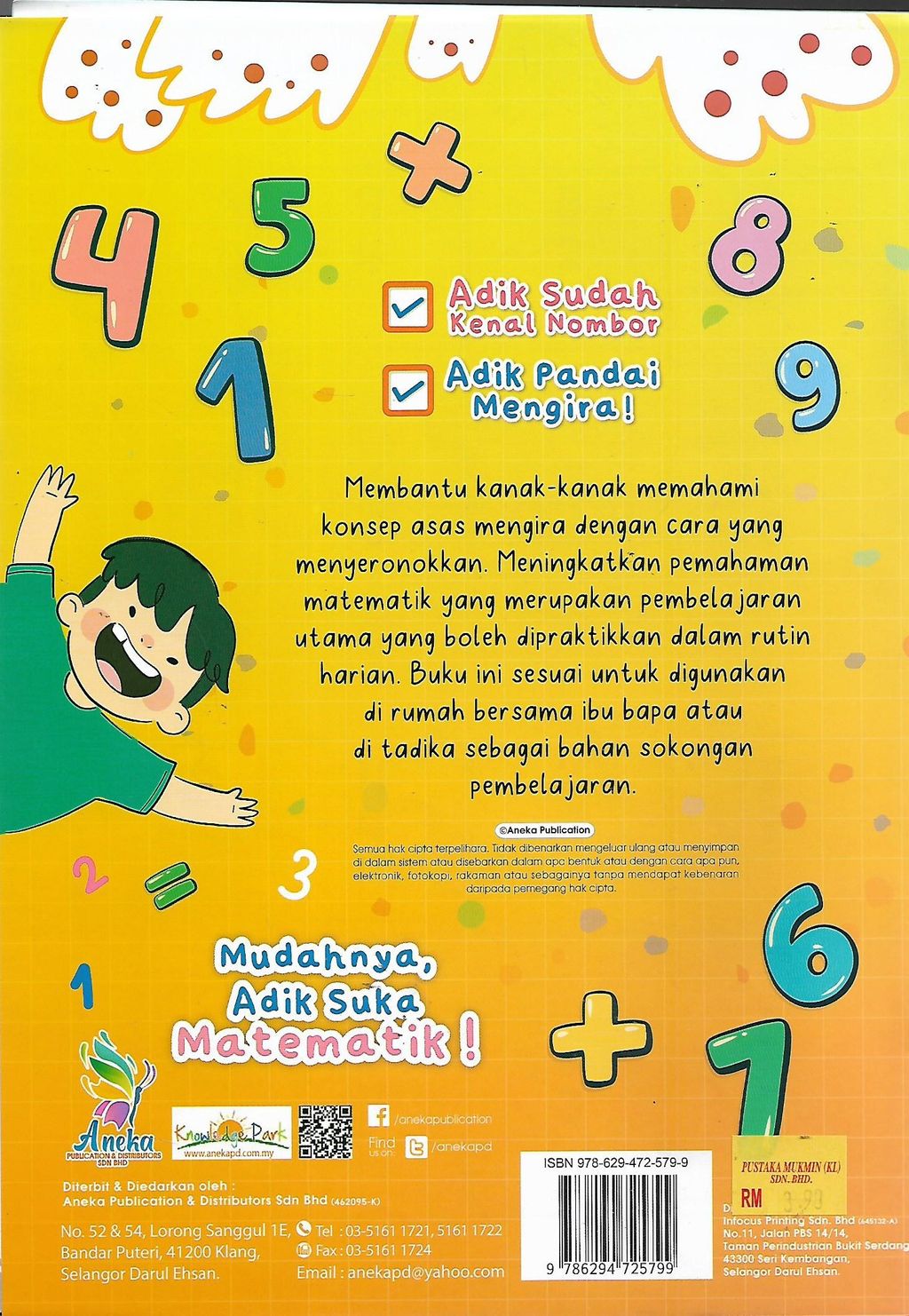 Membantu kanak-kanak memahami konsep asas mengira dengan cara yang menyeronokkan. Meningkatkan pemahaman matematik yang merupakan pembelajaran utama yang boleh diprakktikkan dalam rutin harian. Buku ini sesuai untuk digunakan di rumah bersama ibu bapa atau di tadika sebagai bahan sokongan pembelajaran