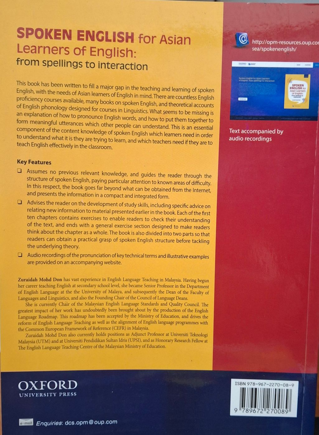This book has been written to fill a major gap in the teaching and learning of spoken English, with the need of Asian learners of English in mind. There are countless English proficiency cources available, many books on spoken English, and theoretical accounts of English phonology designed for cources for Linguistics. What seem to be missing is an explanation of how to pronounce English words, and how to put them together to form meaningful utterances which other people can understand. This is an essential component of the content knowledge of spoken English of which learners need in order to understand what it is they are trying to learn, and which teachers need if they are to teach English effectively in the classroom.
