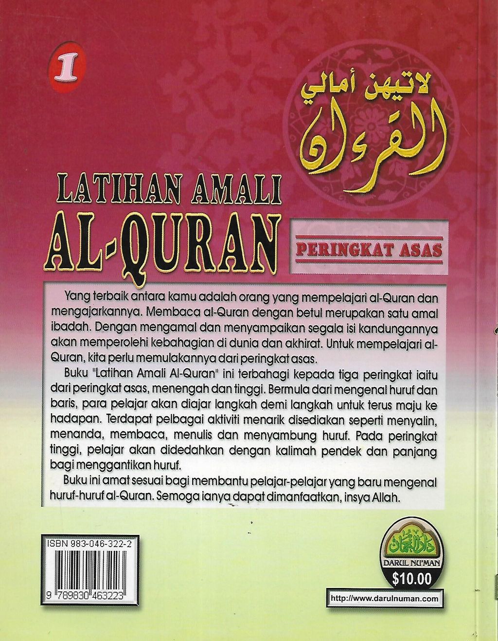 Buku "Latihan Amali Al-Quran" ini terbahagi kepada tiga peringkat iaitu dari peringkat asas, menengah dan tinggi. Bermula dari mengenal huruf dan baris, para pelajar akan diajar langkah demi langkah untuk terus maju ke hadapan. Terdapat pelbagai aktiviti menarik disediakan seperti menyalin, menanda, membaca, menulis dan menyambung huruf. Pada peringkat tinggi, pelajar akan didedahkan dengan kalimah pendek dan panjang bagi menggantikan huruf.